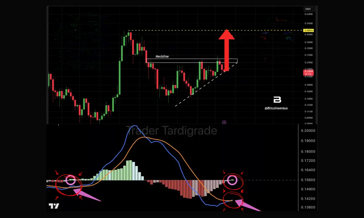 به گفتهٔ تحلیلگر «تریدر تاردیگرید»، یک «تقاطع طلایی» در شاخص MACD در نمودار ۱۲ ساعتهٔ دوج‌ کوین شکل گرفته است. این رویداد تکنیکال زمانی رخ می‌دهد که خط MACD، خط سیگنال را به سمت بالا قطع می‌کند و معمولاً به عنوان نشانه‌ای از تغییر مومنتوم به نفع خریداران تلقی می‌شود.