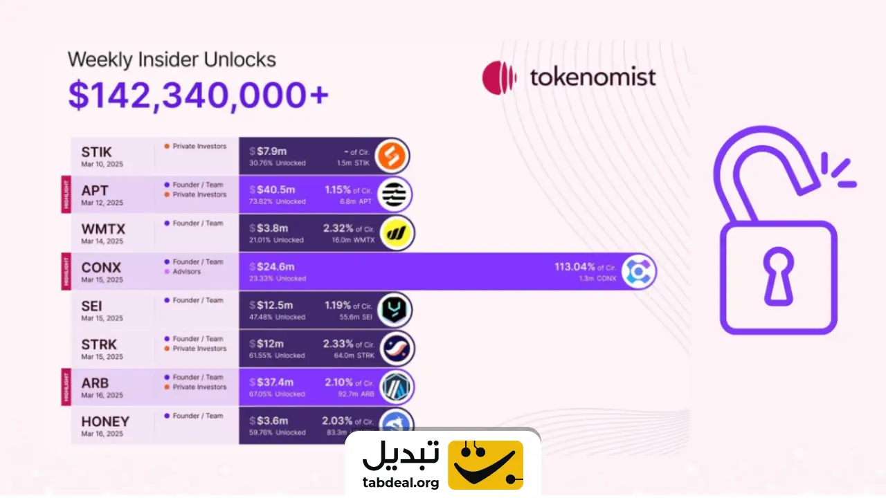 توکن آنلاک یکی از رویدادهای مهم در بازار ارزهای دیجیتال است که میتواند تأثیر قابل توجهی بر قیمت ارزها داشته باشد. در هفته پیش رو، شاهد آزاد شدن بیش از ۱۴۲ میلیون دلار توکن از پروژههای مختلف خواهیم بود. این رویداد میتواند باعث افزایش عرضه در بازار شود و ممکن است بر قیمت ارزهای دیجیتال تأثیر منفی بگذارد. با این حال، همیشه به یاد داشته باشید که بازار ارزهای دیجیتال بسیار پویا است و تغییرات سریع در آن امری طبیعی است.