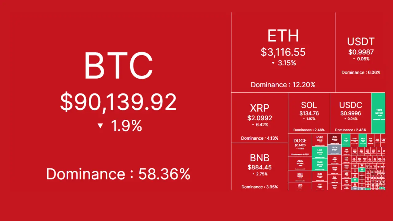 بازار ارزهای دیجیتال روز چهارشنبه را با رنگ قرمز آغاز کرد و بیت کوین با از دست دادن کانال ۹۳،۰۰۰ دلار، حدود ۲ درصد کاهش قیمت را تجربه کرد. اتریوم نیز با افتی جزئی به ۳،۱۵۶ دلار رسید و ارزش کل بازار با کاهشی ۱ درصدی به ۳.۲۴ تریلیون دلار عقبنشینی کرد.