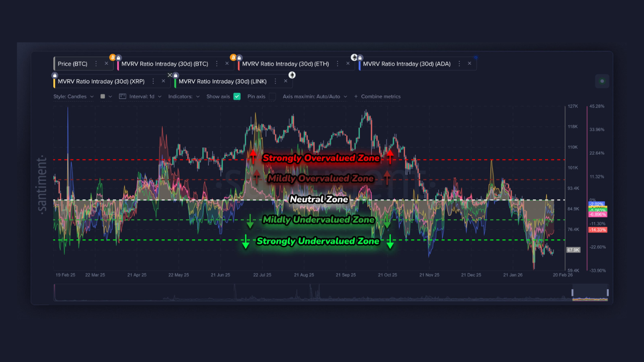 بازار ارزهای دیجیتال در حال حاضر با روزهای اوج خود فاصله دارد و بیشتر داراییها ۵۰ درصد یا بیشتر از سقفهای قیمتی ثبت شده در سال گذشته سقوط کردهاند. در این میان، داراییهای بزرگی مانند بیت کوین، اتریوم، ریپل، لینک و کاردانو میتوانند فرصتهای ورود مناسبی را برای سرمایهگذاران فراهم کنند. پلتفرم تحلیلی سنتیمنت با بررسی شاخص ارزش بازار به ارزش تحققیافته (MVRV)، میزان کمتر از ارزش ذاتی بودن این داراییها را مشخص کرده است.