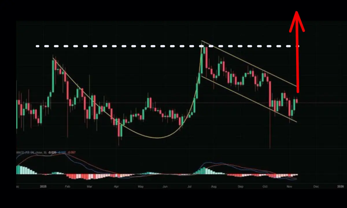 - اهمیت: این الگو یکی از معتبرترین الگوهای ادامهدهندهٔ صعودی است. شکست موفقیتآمیز سقف این الگو میتواند راه را مستقیماً برای رسیدن به هدف ۵ دلاری باز کند. همزمان، شاخص MACD در همین نمودار در آستانهٔ ثبت یک «تقاطع صعودی» (Bullish Cross) است.