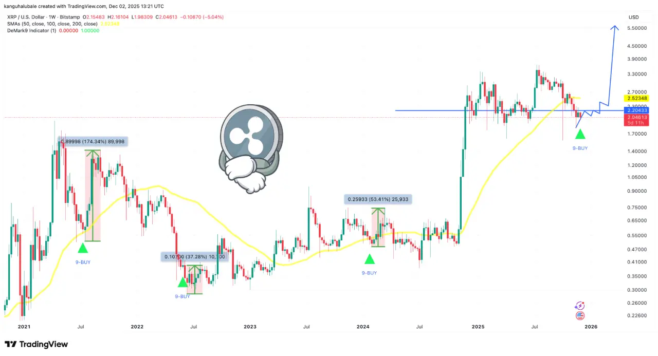 در کنار این سیگنال، اندیکاتور TD Sequential در نمودار هفتگی ریپل نیز یک سیگنال خرید صادر کرده است. بررسی داده‌های تاریخی نشان می‌دهد که از سال ۲۰۲۱، هر بار TD Sequential سیگنال خرید داده، قیمت ریپل بین ۳۷ تا ۱۷۴ درصد رشد کرده است.