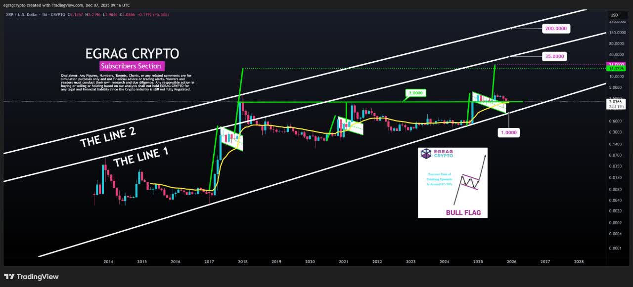ساختار ماهانه XRP همچنان با کانال ماکرو تاریخی هم‌ راستا است؛ کانالی که از آغاز شکل‌گیری این دارایی، مسیر قیمت را هدایت کرده و در تحلیل‌ها با نام «خط یک» شناخته می‌شود.