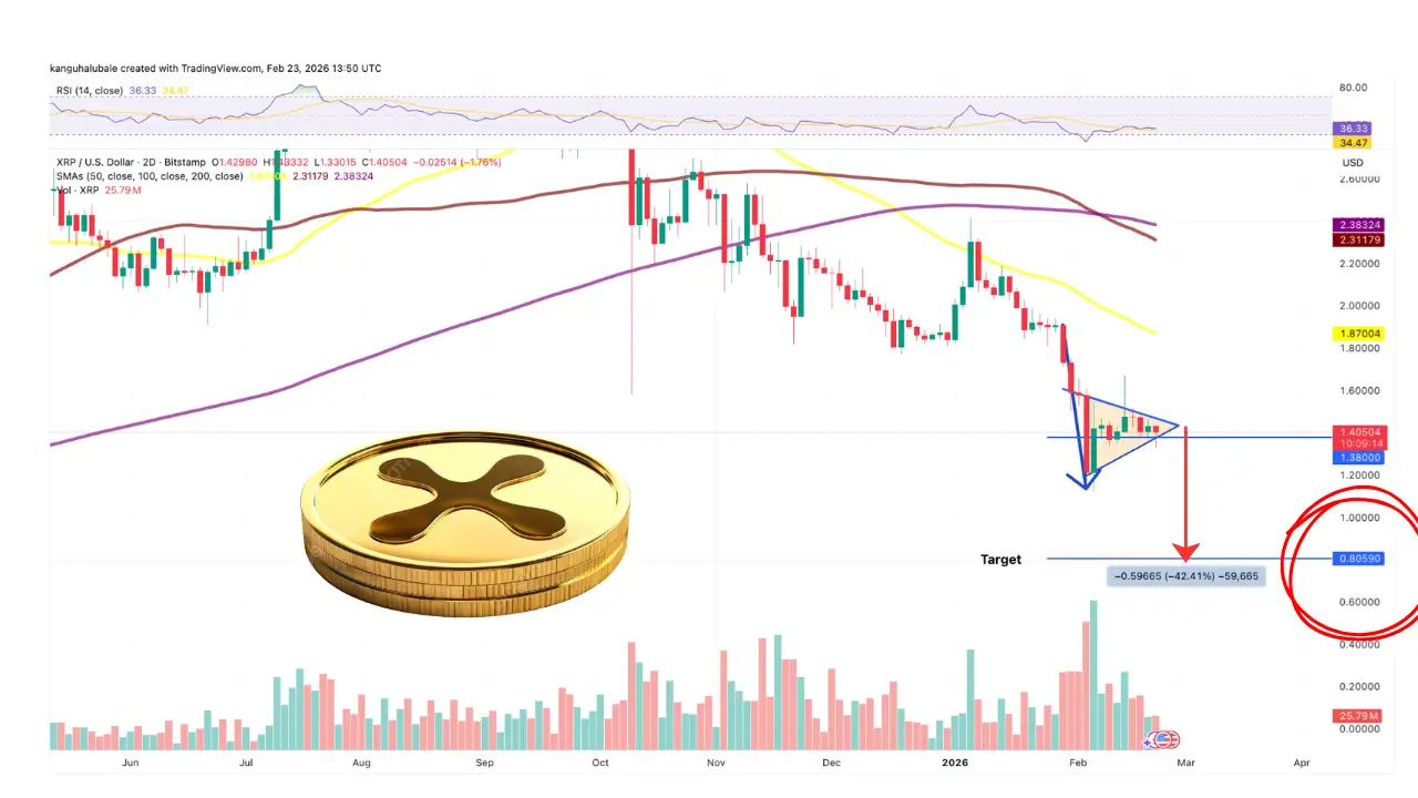 در حال حاضر، قیمت ریپل زیر میانگینهای متحرک کلیدی باقی مانده است که نشاندهنده ضعیف شدن مومنتوم بازار است. یک شکست قاطع به زیر حمایت این الگو میتواند راه را برای رسیدن به سطح ۰.۸۰ دلار باز کند که حدود ۴۲ درصد پایینتر از سطوح فعلی است.