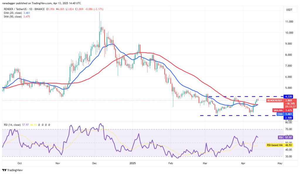 رندر به مقاومت ۴.۲۲ دلار رسیده و در صورت عبور از آن، میتواند تا ۵ و در ادامه ۵.۹۴ دلار رشد کند. افت به زیر میانگینهای متحرک میتواند نشانهی آغاز نوسان در محدودهی فعلی باشد.