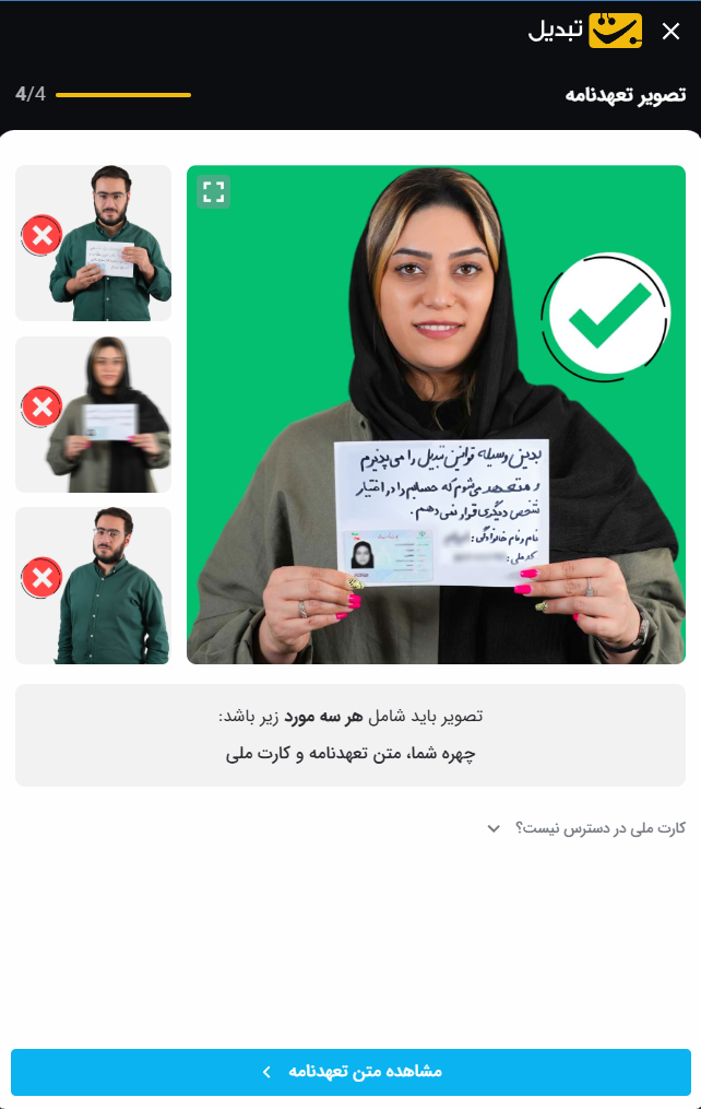 درحالی‌که کارت شناسایی و متن تعهدنامه را در دست دارید، یک عکس از خودتان تهیه کنید.