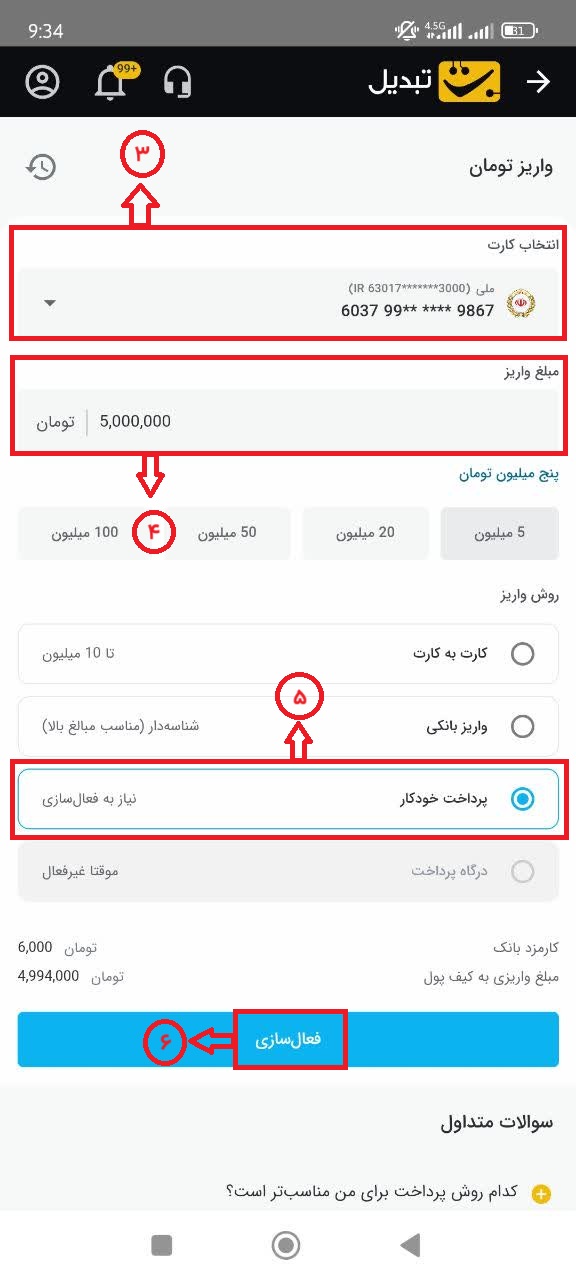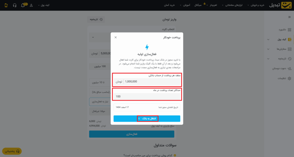برای فعال‌سازی پرداخت خودکار در صرافی تبدیل، ابتدا باید از طریق درگاه بانک، مجوز اولیه را فعال کنید. این فرآیند در هر همراه بانک متفاوت است. با انتخاب این گزینه، کیف پول تبدیل شما به‌صورت خودکار شارژ خواهد شد.