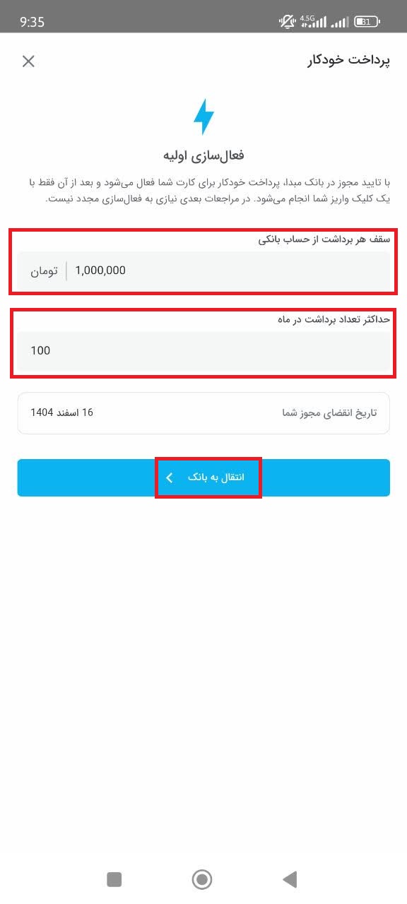 ۷. سقف هر برداشت از حساب و تعداد برداشت در هر ماه را مشخص کنید و در نهایت انتقال به بانک را بزنید.