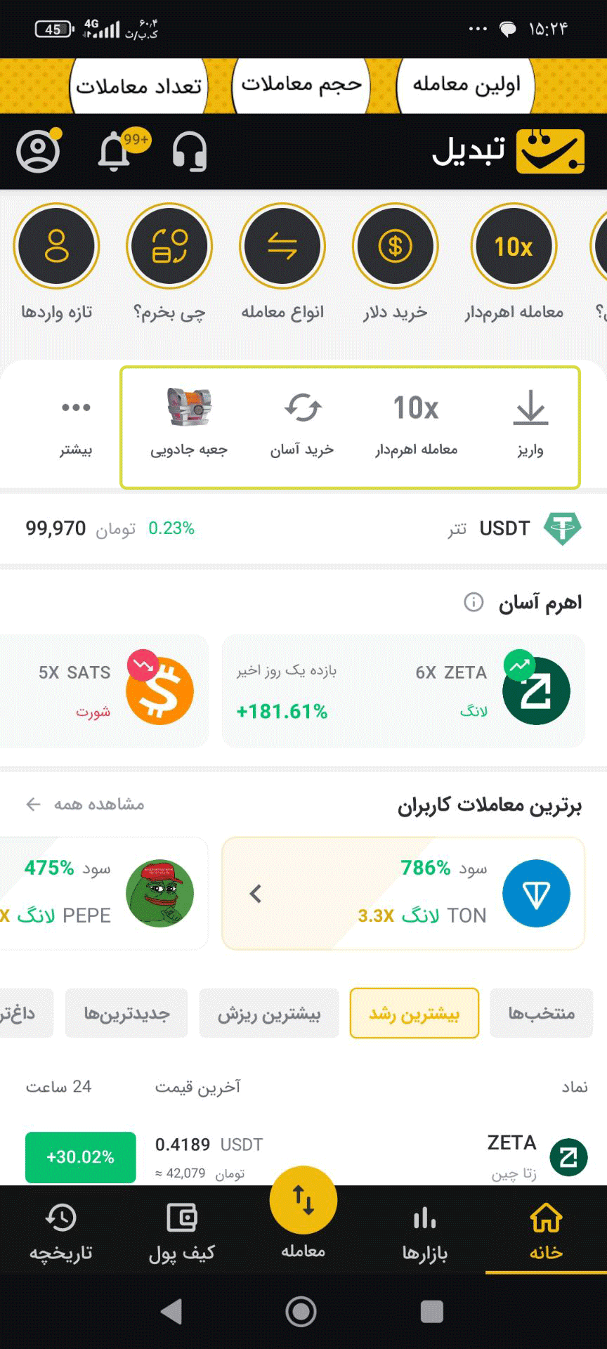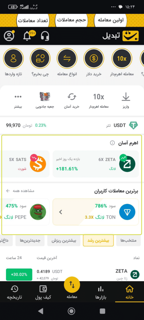 در این صفحه همچنین مجموعه‌ای از ابزارهای معاملاتی مانند واریز سریع، معاملات اهرم‌دار و خرید آسان قرار دارد.