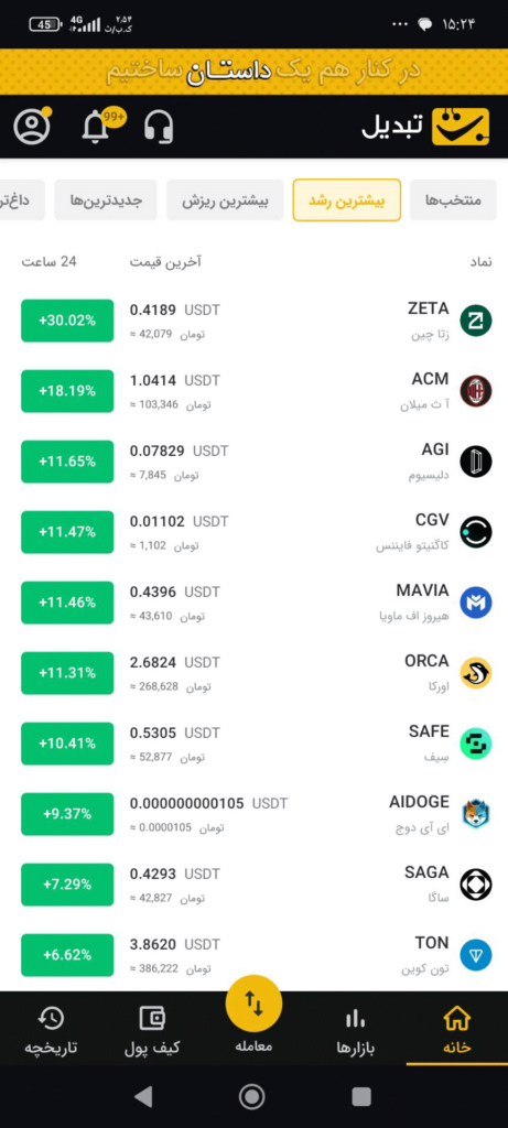 در انتهای صفحه، لیستی از تمامی ارزهای دیجیتال قابل‌معامله در صرافی تبدیل را مشاهده خواهید کرد. این بخش، فیلترهایی ارائه می‌دهد که با استفاده از آن‌ها می‌توانید ارز مورد نظر خود را سریع‌تر پیدا کنید. همچنین می‌توانید لیستی از ارزهای دیجیتال محبوب خود ایجاد کنید یا ارزهایی با بیشترین رشد، بیشترین ریزش و جدیدترین ارزهای اضافه‌شده به صرافی را مشاهده کنید.