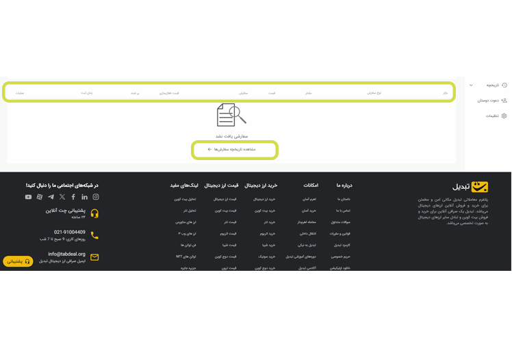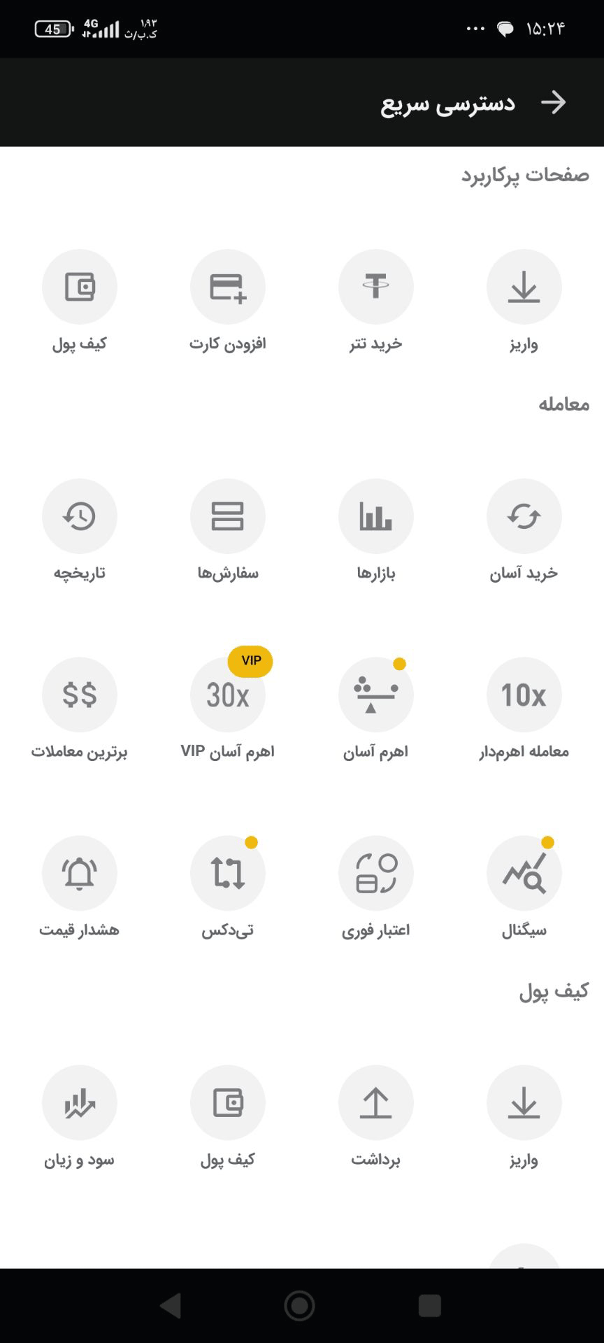 با کلیک روی گزینه «بیشتر» نیز می‌توانید به صفحات پرکاربرد، ابزارهای معاملاتی، کیف پول، حساب کاربری و پشتیبانی دسترسی پیدا کنید. پیگیری واریز ناموفق و تمدید زمان آدرس واریز نیز از این قسمت انجام می‌شود.