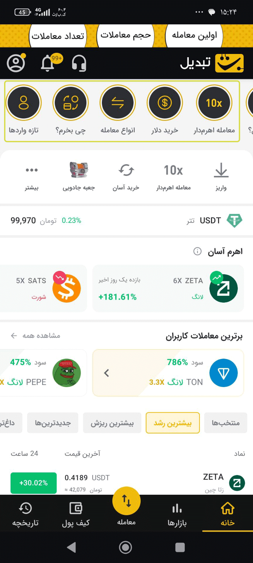 داشبورد معاملاتی پلتفرم تبدیل، بستری است که تمام امکانات و اطلاعات مورد نیاز برای انجام معاملات را در دسترس معامله‌گران قرار می‌دهد. با استفاده از این بخش می‌توانید به‌سرعت به ابزارهای معاملاتی، ارزهای دیجیتال، سفارشات باز، تاریخچه معاملات و سایر امکانات کلیدی دسترسی پیدا کنید. برای دسترسی آسان به این بخش ابتدا وارد اپلیکیشن صرافی تبدیل شوید. صفحه اصلی آن، داشبورد شماست که اطلاعات کلیدی و ابزارهای معاملاتی را در یک نگاه نمایش می‌دهد. در بالای صفحه می‌توانید اطلاعیه‌ها و آموزش‌های صرافی تبدیل را از بخش «استوری‌ها» دنبال کنید.