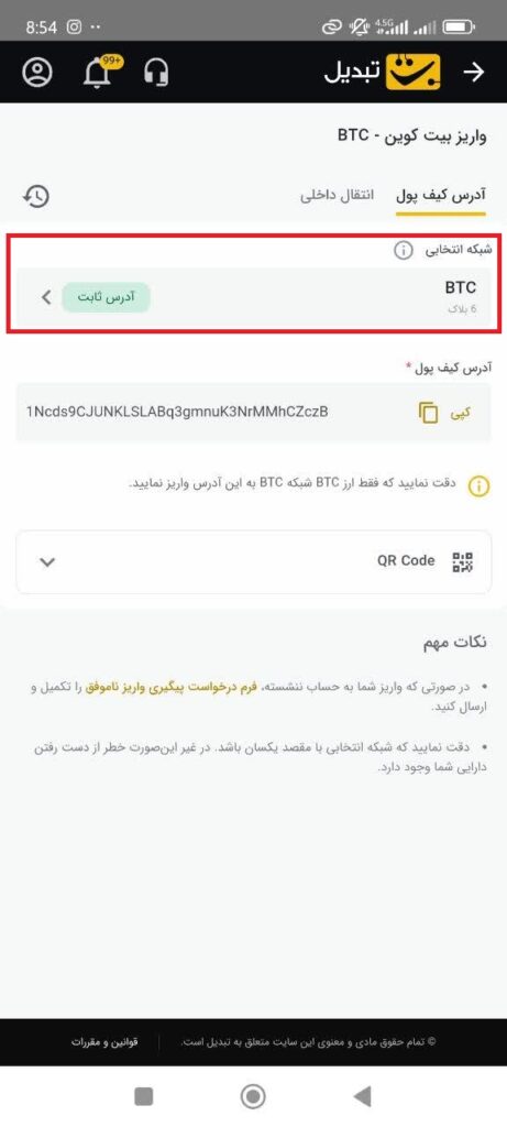 ۳. شبکه انتقال خود را بهدرستی انتخاب کنید. (شبکههای مختلف در میزان سرعت، امنیت، کارایی و کارمزد متفاوتاند. توجه داشته باشید که شبکه واریز و برداشت شما باید یکسان باشند. در غیر این صورت، احتمال از بین رفتن دارایی وجود دارد.)