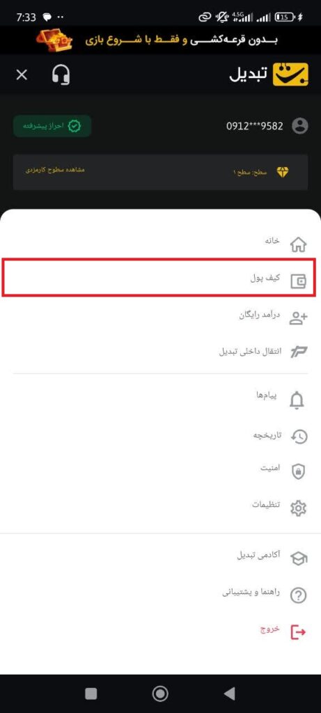 ۱. در حساب کاربری خود، به بخش کیف پول بروید.
