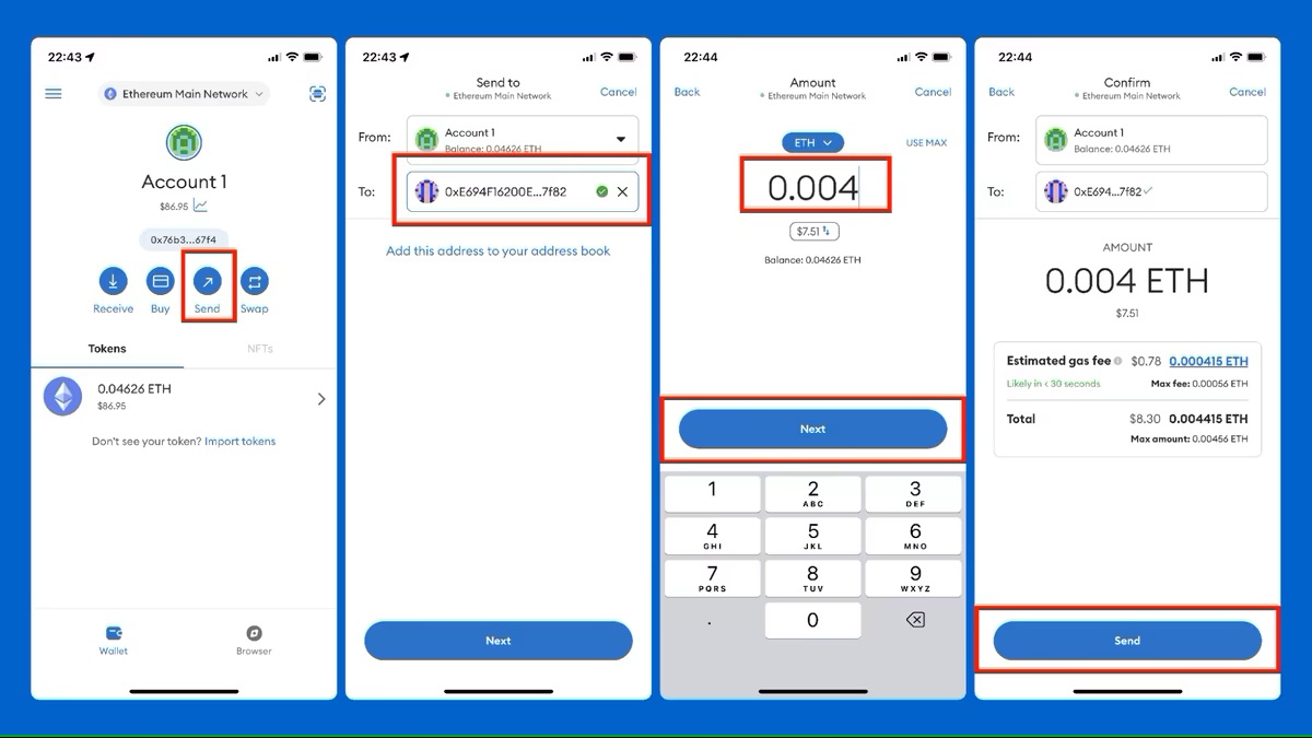 ۵. در کیف پول مبدأ، ارز موردنظر را انتخاب کنید و به بخش برداشت «SEND» بروید. (ما در این مورد، کیف پول متامسک را مثال زدیم. مراحل ممکن است در کیف پولهای مختلف، کمی تفاوت داشته باشند.)