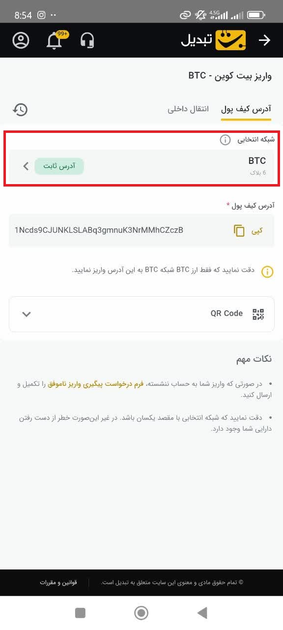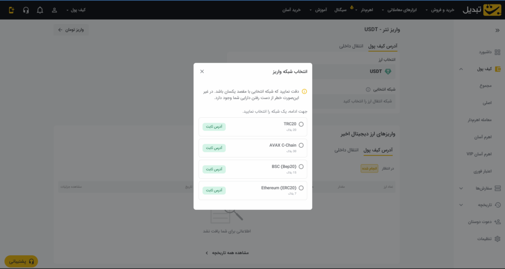 ۳. شبکه انتقال خود را بهدرستی انتخاب کنید. (شبکههای مختلف در میزان سرعت، امنیت، کارایی و کارمزد متفاوتاند. توجه داشته باشید که شبکه واریز و برداشت شما باید یکسان باشند. در غیر این صورت، احتمال از بین رفتن دارایی وجود دارد.)
