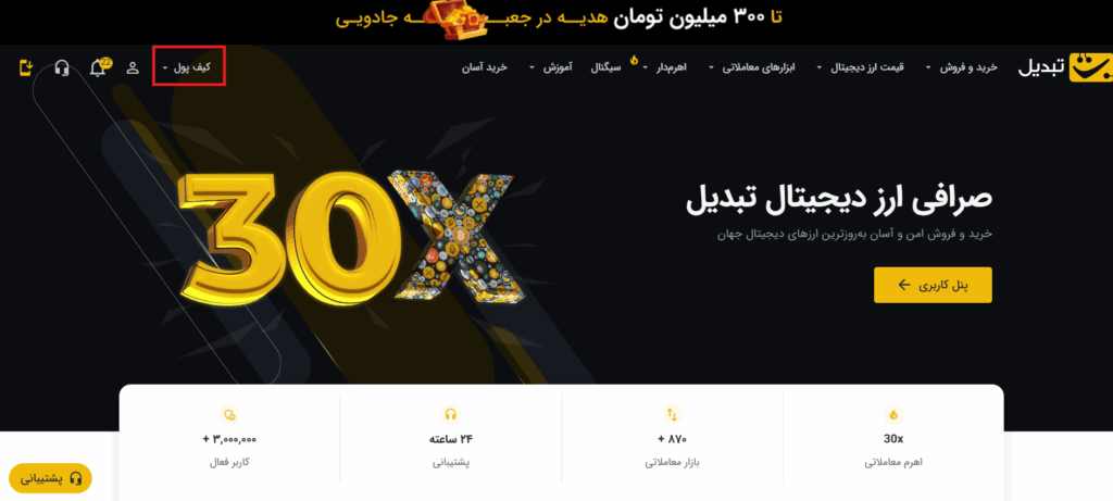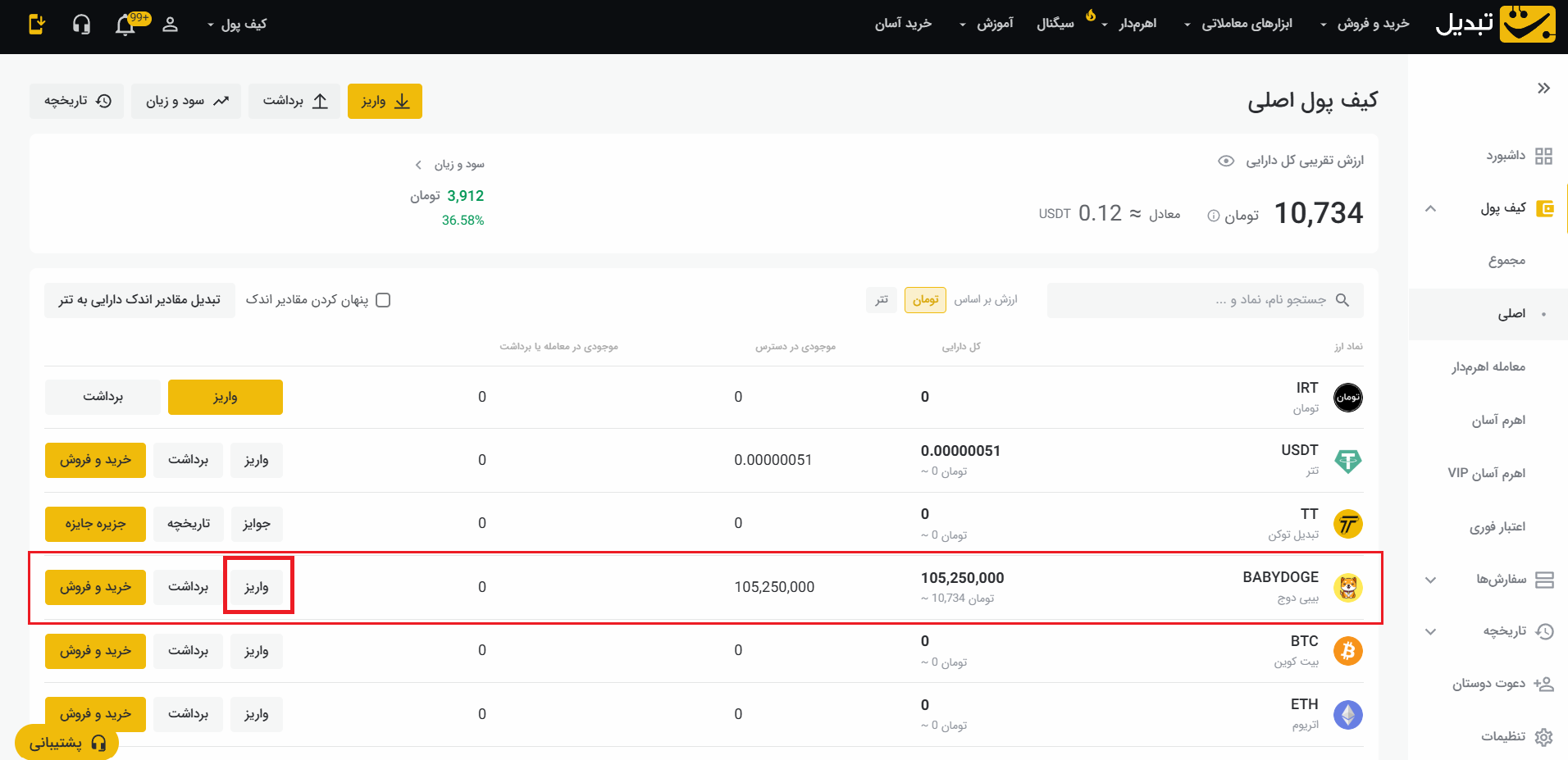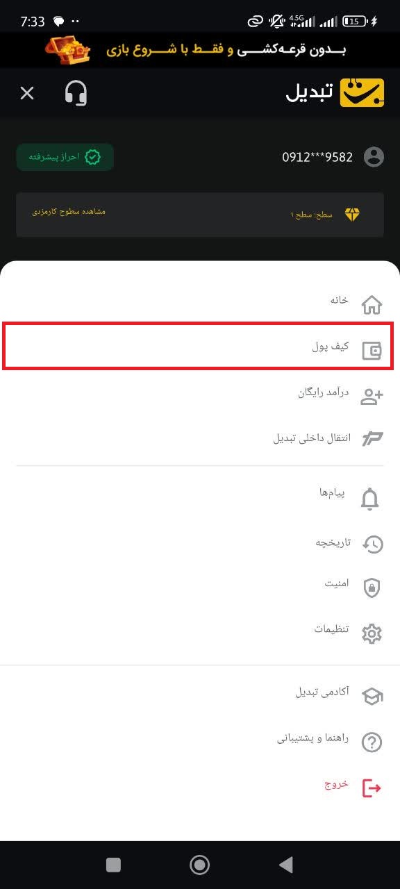 ۱. در حساب کاربری خود، به بخش کیف پول بروید.