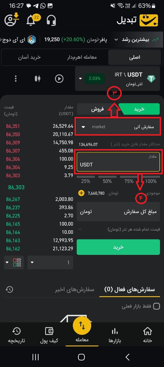 ۴. مقدار ارز دیجیتالی که قصد خرید یا فروش آن را دارید، وارد کنید.