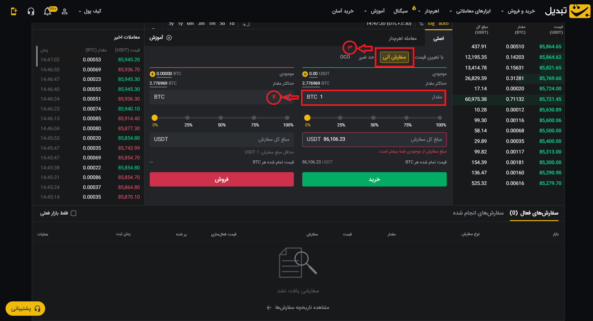 نکته: توجه داشته باشید که در روش سفارش آنی، قیمت بر اساس قیمت لحظه‌ای بازار تعیین می‌شود و شما فقط مقدار موردنظر خود را وارد می‌کنید. این روش ثبت سفارش، امکان معامله سریع و بدون نیاز به تعیین قیمت به‌صورت دستی را فراهم می‌کند.