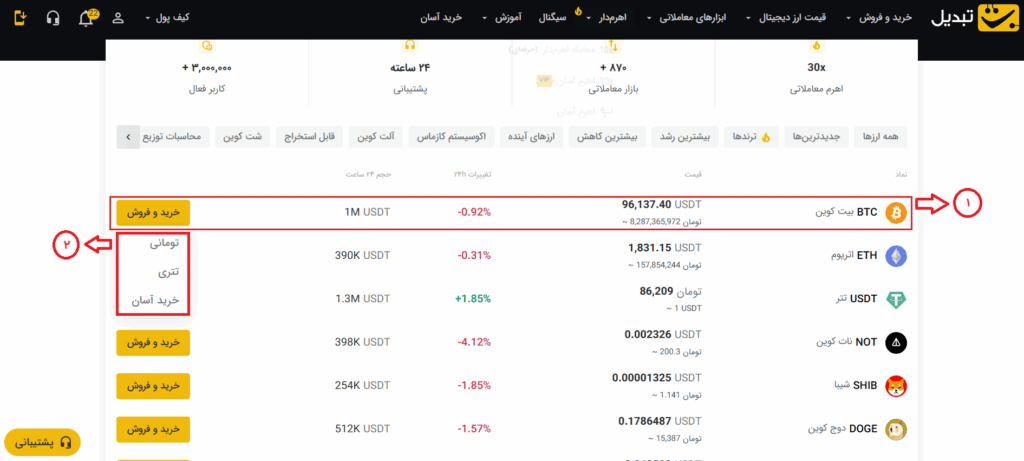۱. ارز دیجیتالی که می‌خواهید معامله کنید را انتخاب کنید.