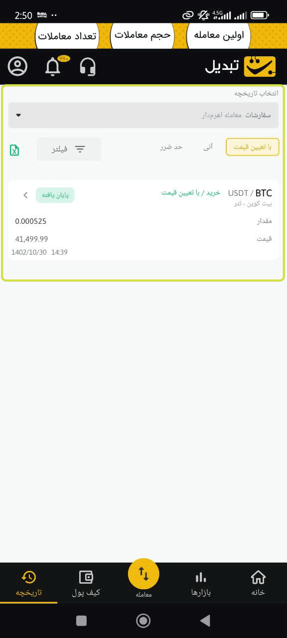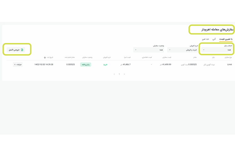 در این صفحه، می‌توانید با انتخاب نوع سفارش و بازار معاملاتی مورد نظر، سفارش‌های باز و اتمام‌یافته خود را مشاهده کنید. این بخش، اطلاعات جامعی از جمله نوع سفارش (با تعیین قیمت، آنی وحد ضرر)، قیمت تعیین‌شده، مقدار ارز، وضعیت سفارش، تاریخ و زمان ثبت و سایر جزئیات مربوط به هر سفارش را در اختیار شما قرار می‌دهد.