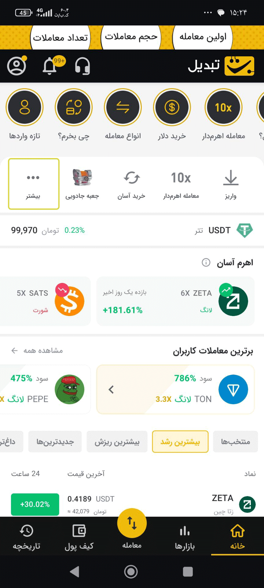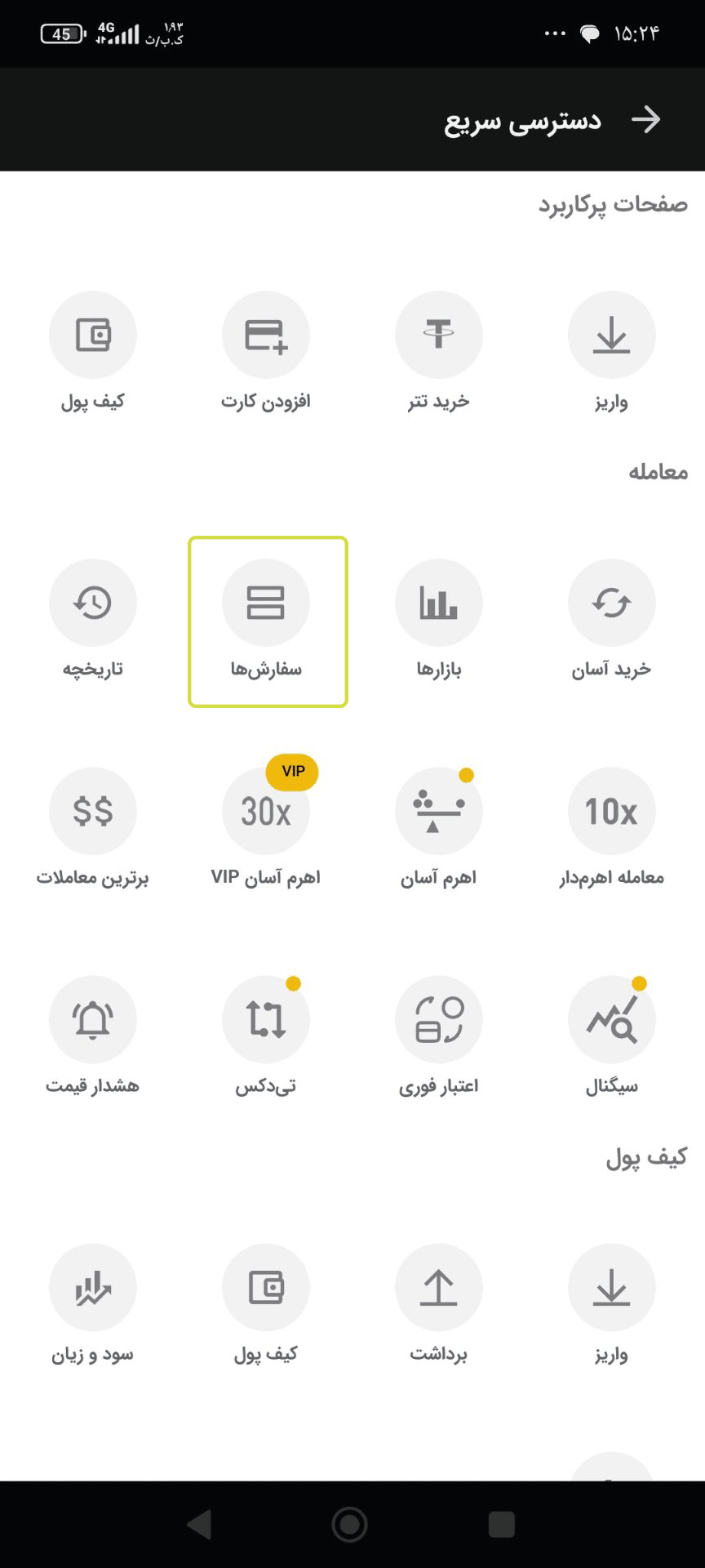 بخش سفارش‌ها اپلیکیشن صرافی تبدیل، به شما امکان می‌دهد تا به‌طور کامل بر فعالیت‌های خود در بازارهای معاملاتی نظارت داشته باشید و تمامی سفارش‌های فعال، تکمیل‌شده و در انتظار خود را مشاهده کنید. برای دسترسی به این بخش، ابتدا وارد حساب کاربری خود شوید و گزینه «بیشتر» را انتخاب کنید.