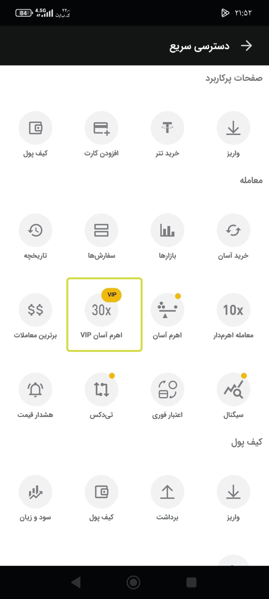 اهرم تا سقف ۱۰ در دسترس تمام کاربران قرار دارد. برای معامله با اهرم‌ بالاتر لازم است ابتدا حجم معاملات ماهانه خود را با اهرم آسان افزایش دهید. حجم معاملات، مجموع حاصل‌ضرب مبلغ ورودی در اهرم استفاده‌شده برای هر معامله است.