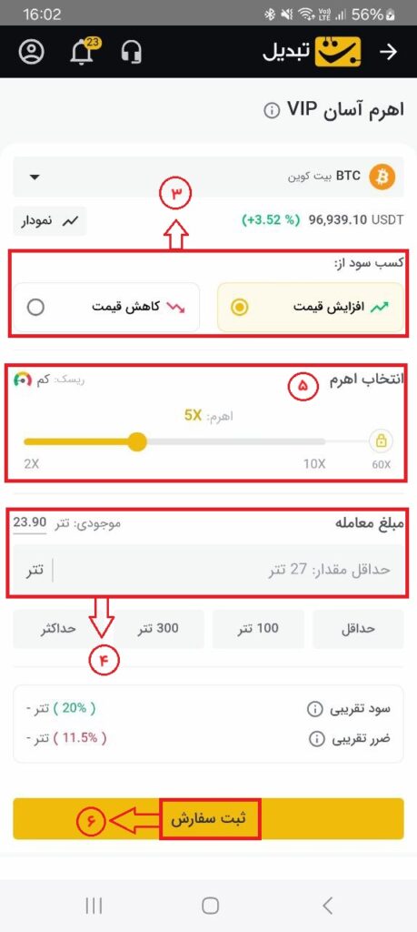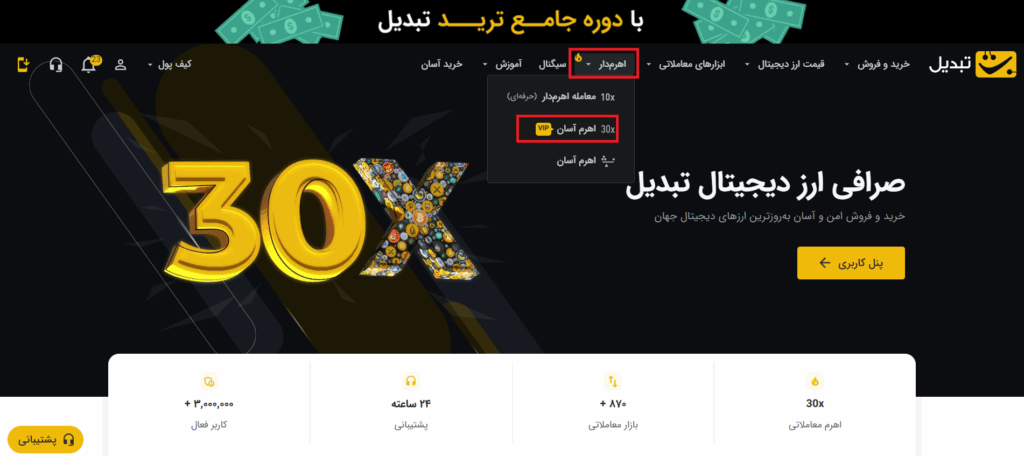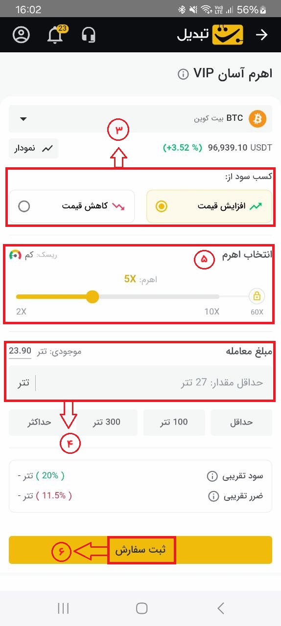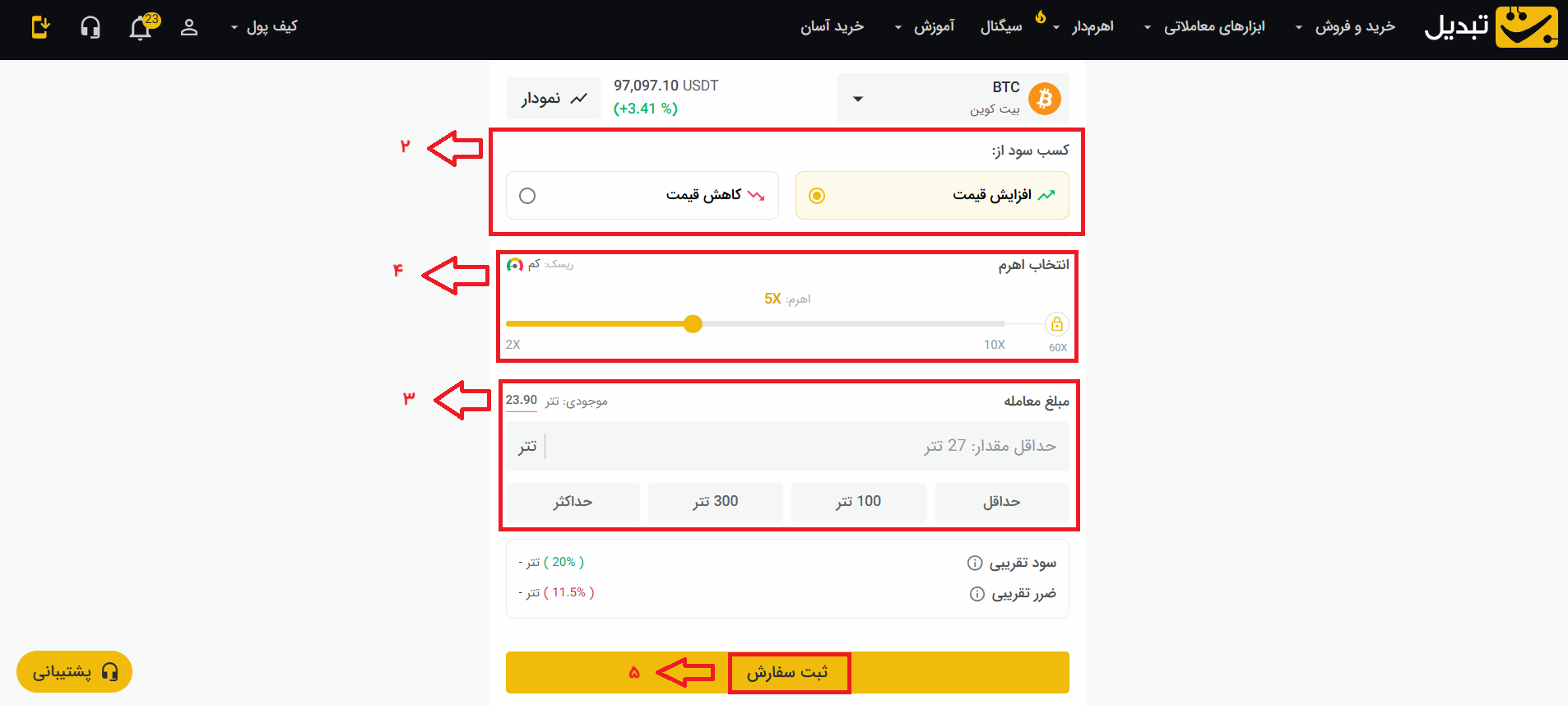 در صرافی تبدیل شما می‌توانید معاملات برخی از ارزهای دیجیتال مانند بیت‌کوین (BTC) و پپه (PEPE) را با اهرم ۶۰ انجام دهید. در این نوع معاملات، سیستم به‌صورت خودکار حد سود (Take Profit) و حد ضرر (Stop Loss) را تعیین می‌کند تا از لیکوئید شدن سرمایه جلوگیری کند.