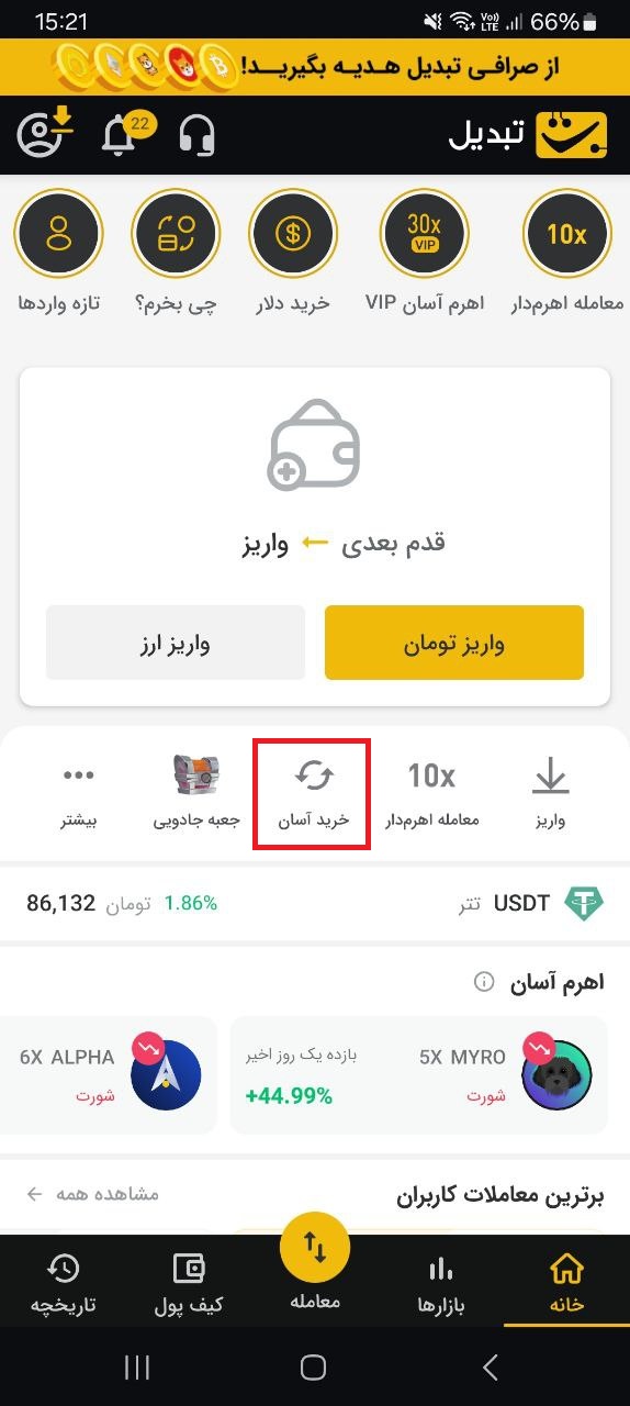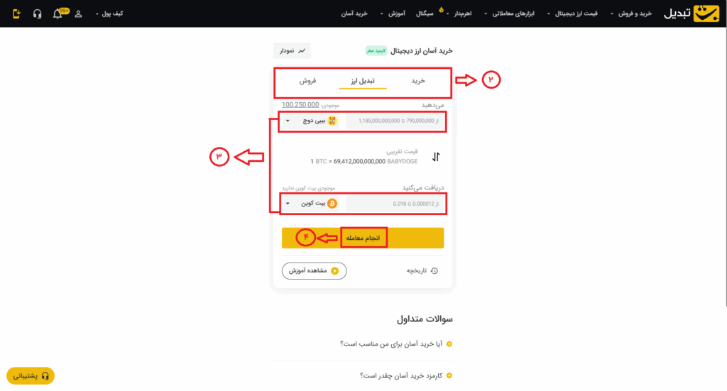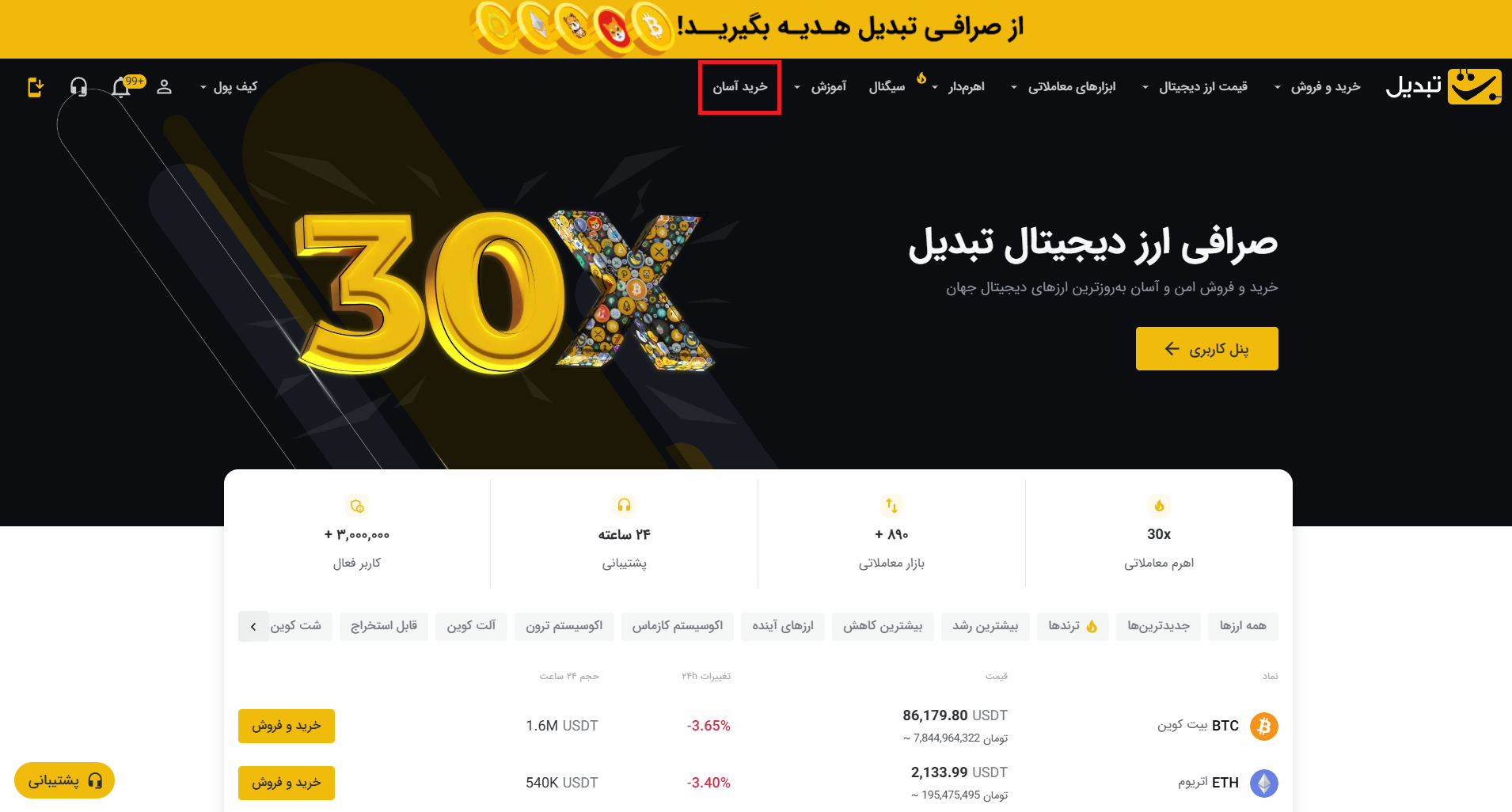 معاملهگران در صرافی ارز دیجیتال تبدیل میتوانند در بازارهای معاملات تتری و تومانی و بخش خرید آسان، معاملات خود را انجام دهند. توجه داشته باشید که در بخش خرید آسان، شما ارز دیجیتال را مستقیم از صرافی خریداری میکنید. صرافی تبدیل در این بخش از ارزهای متنوعی مثل بیتکوین، اتریوم، شیبا، بیبیدوج، ریپل و… پشتیبانی میکند.