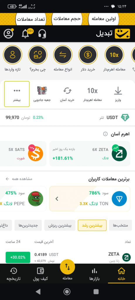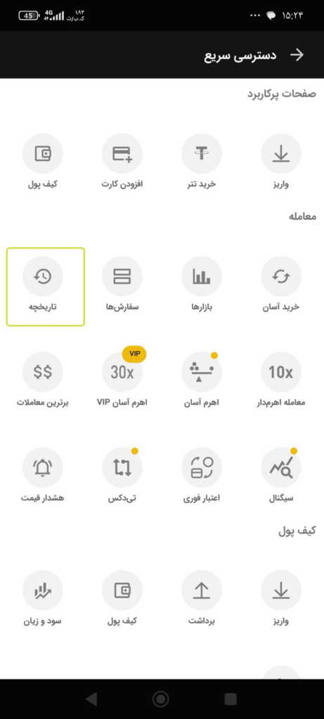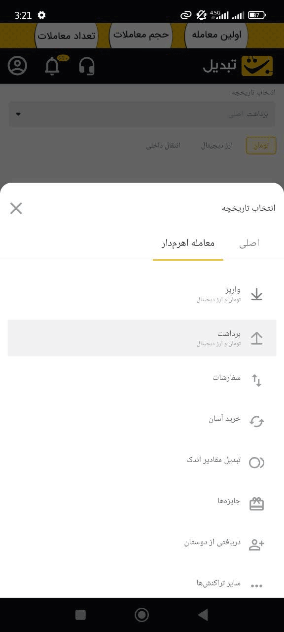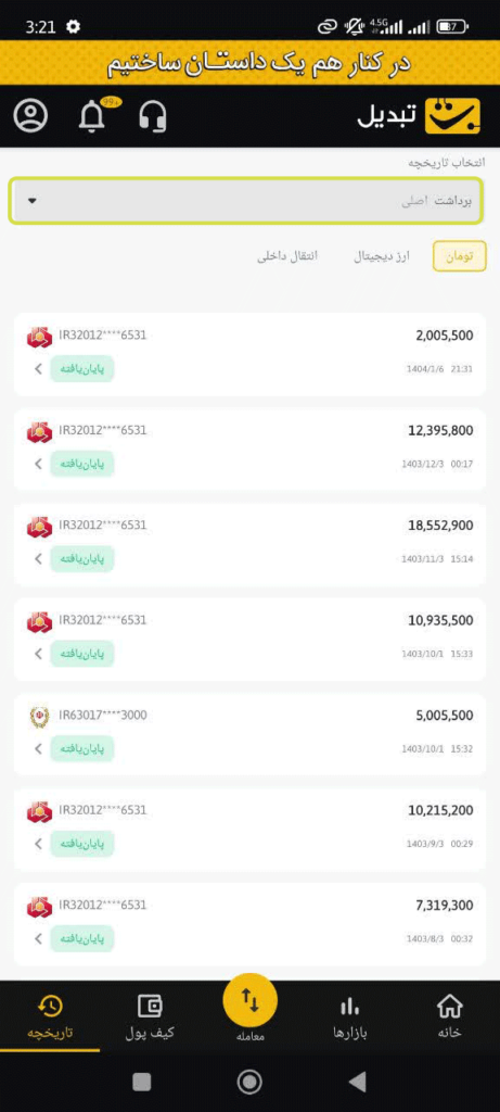 صفحه تاریخچه در صرافی تبدیل، یک دفترچه حساب دیجیتال جامع است که تمامی تراکنش‌های مالی شما را به‌صورت دقیق و شفاف ثبت می‌کند. این بخش به شما کمک می‌کند تا به طور کامل بر گردش مالی خود نظارت داشته باشید و در صورت نیاز، تراکنش‌های مورد نظر خود را بررسی کنید. برای دسترسی به این بخش کافی است در اپلیکیشن صرافی، گزینه بیشتر را انتخاب کنید.