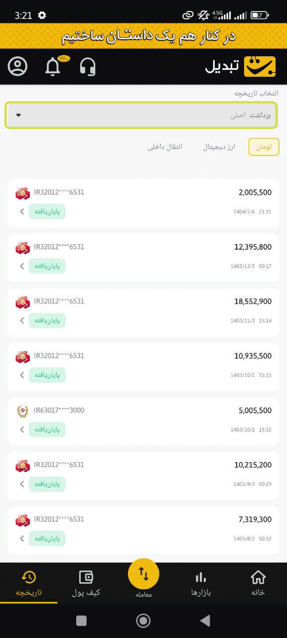 تاریخچه شما در تبدیل برای مشاهده تاریخچه معاملاتی خود در صرافی تبدیل، کلیک کنید.