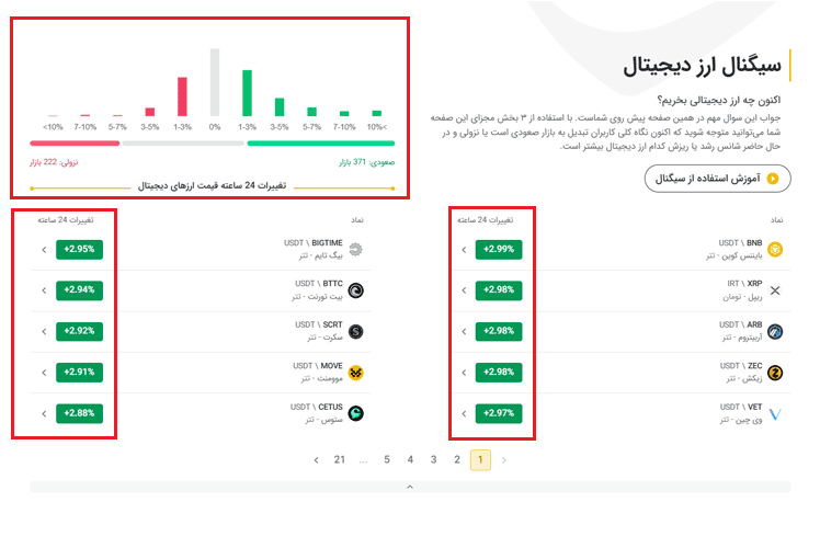 ۳. در بخش «تغییرات ۲۴ ساعته قیمت ارزهای دیجیتال» نوسانات قیمتی رمزارزها در ۲۴ ساعت گذشته بر اساس درصد نمایش داده می‌شود. با انتخاب هر نمودار می‌توانید تغییرات قیمتی رمزارزها در آن بازه زمانی را مشاهده کنید.