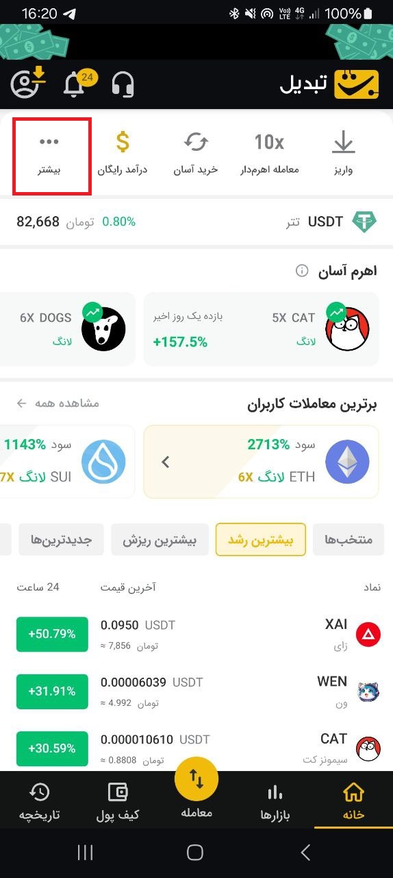 ۱. در اپلیکیشن صرافی تبدیل، گزینه «بیشتر» را بزنید.