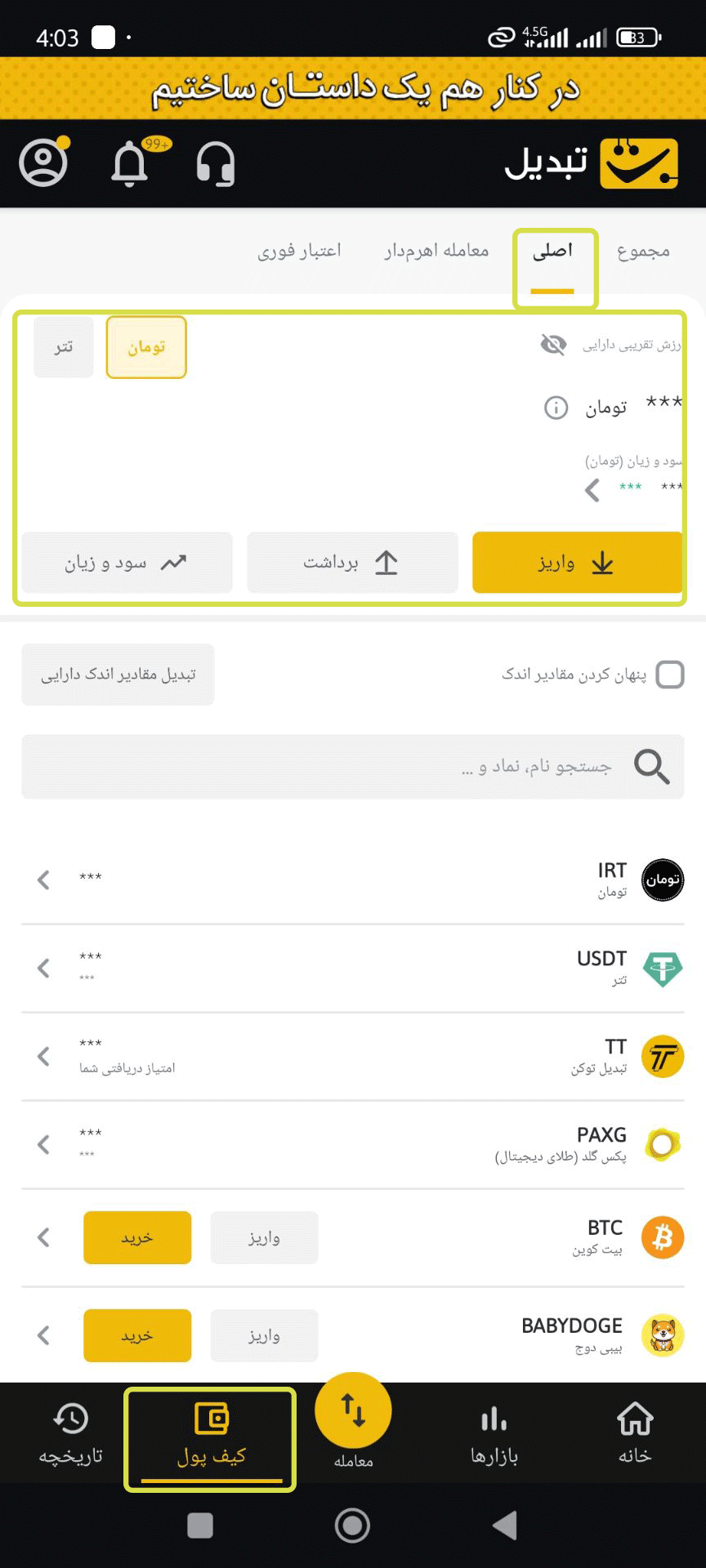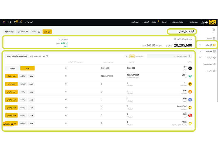 در این بخش میتوانید دارایی خود در کیف پول اصلی را مشاهده کنید. امکاناتی نظیر واریز و برداشت آسان، مشاهده تاریخچه تراکنشها و بررسی سود و زیان معاملات، در این بخش قرار دارند.
