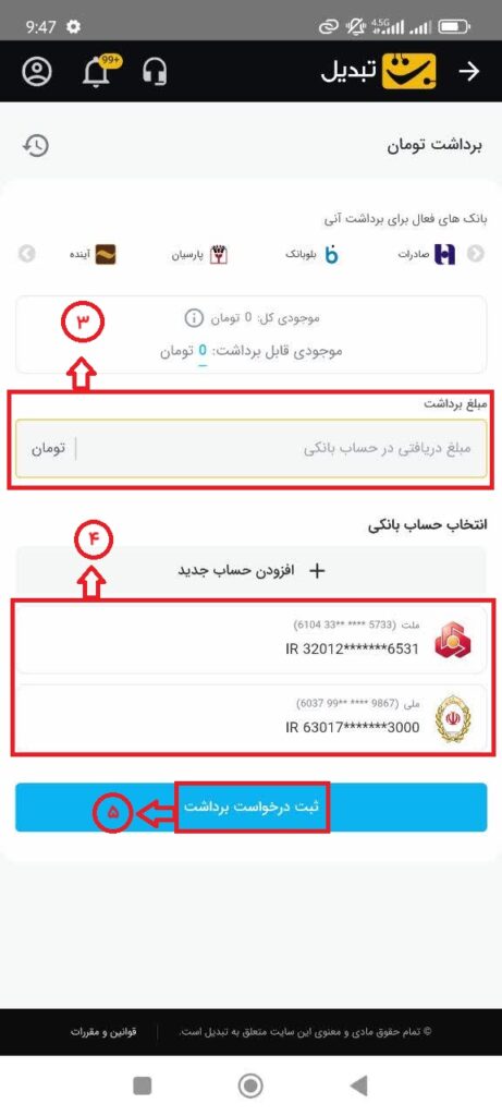 ۳. مبلغی که میخواهید برداشت کنید را مشخص کنید.