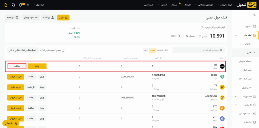۲. در لیست رمزارزها، گزینه «برداشت» تومان را بزنید.