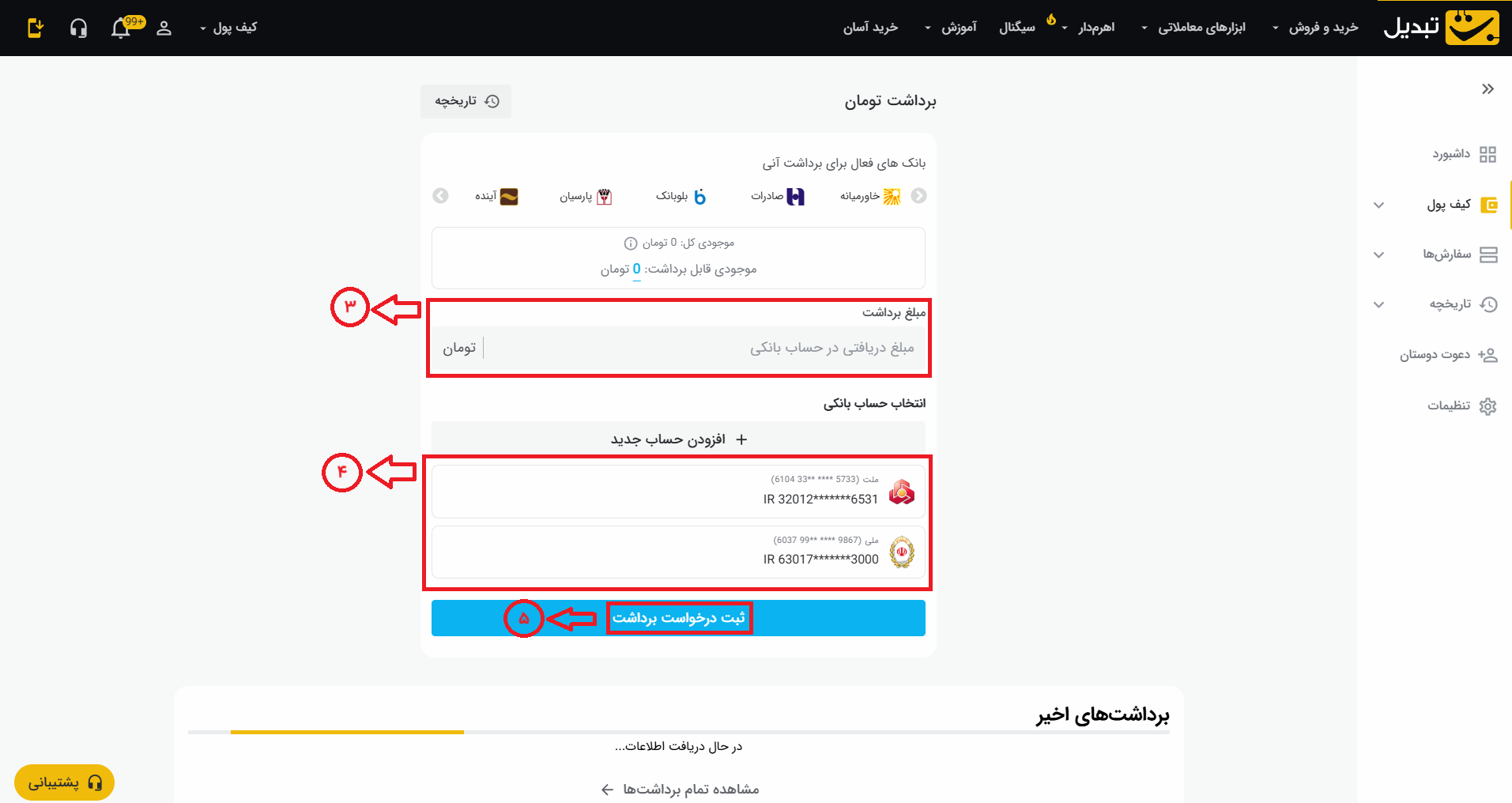 برای برداشت تومان از کیف پول صرافی تبدیل به کارت بانکی خود، مراحلی که در ادامه گفته میشود را دنبال کنید.