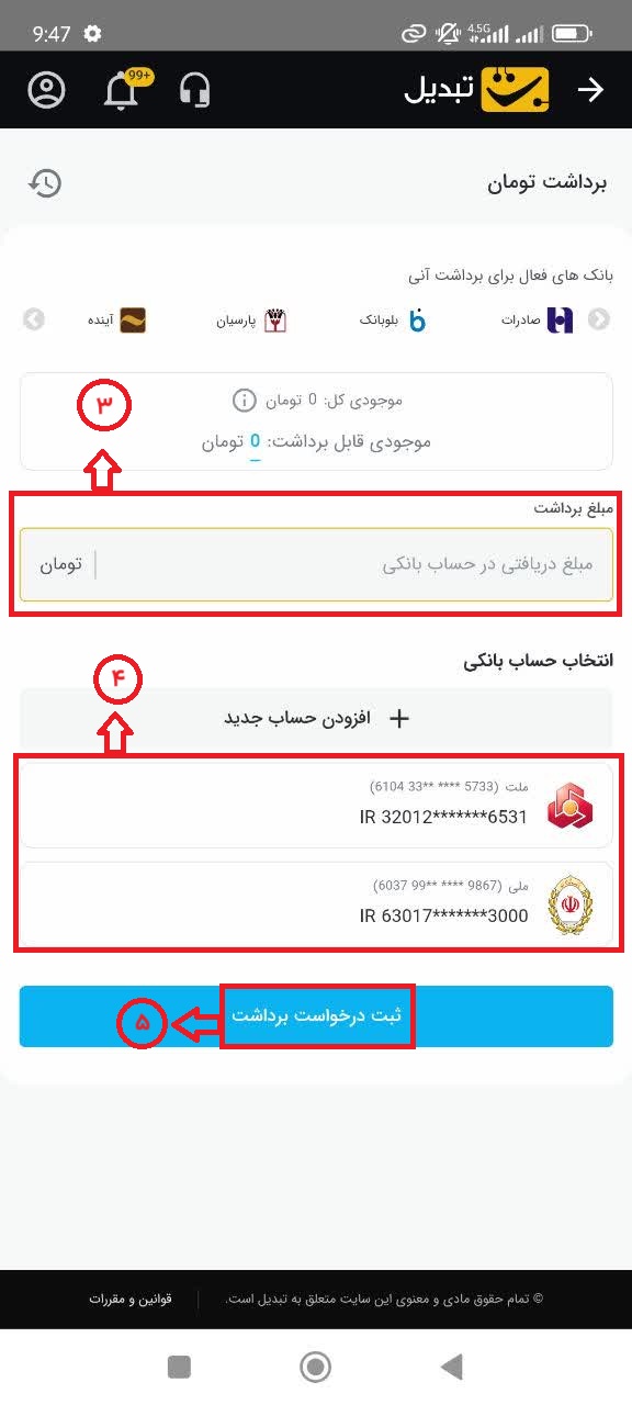 ۳. مبلغی که میخواهید برداشت کنید را مشخص کنید.