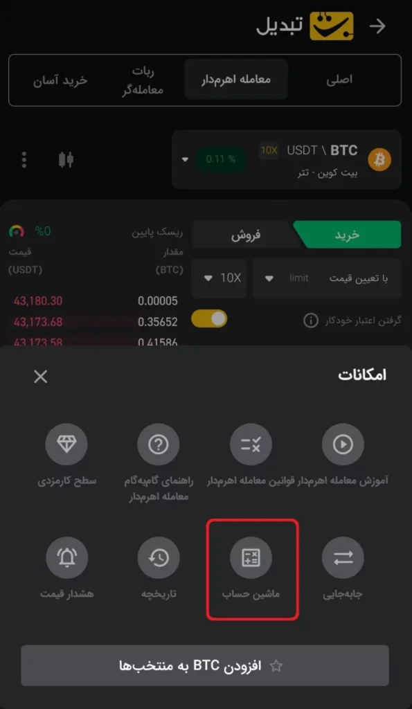 صرافی تبدیل برای کاربران خود شرایطی فراهم کرده تا پیش از انجام معامله با اهرم کلاسیک بتوانند میزان سود و زیان، قیمت خروج مناسب و قیمت لیکویید شدن معامله خود را محاسبه کنند. این فرآیند با استفاده از ماشین حساب انجام میشود.