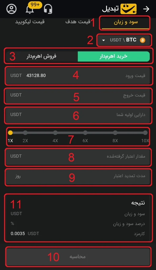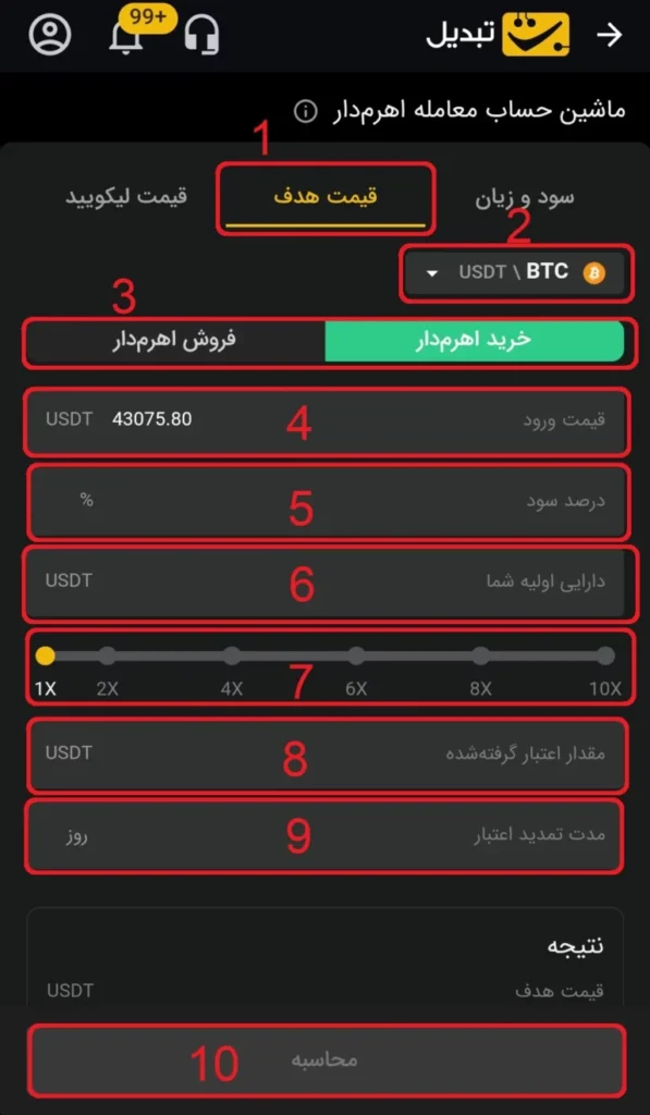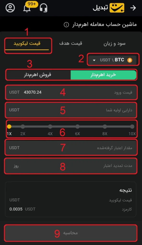 ۸. میزان اعتباری که از صرافی قرض میگیرید، با توجه به دارایی اولیه و اهرم انتخابی شما محاسبه میشود.