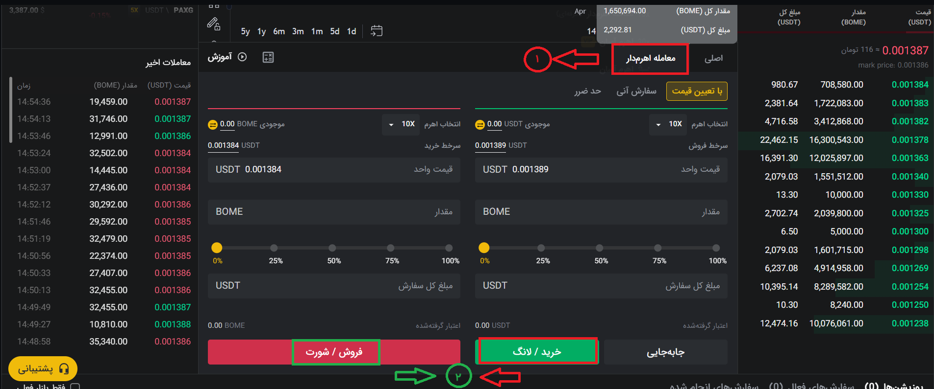 ۴. انتخاب نوع معامله: از بین گزینههای تعیین قیمت، سفارش آنی و حد ضرر، یکی را انتخاب کنید. (در این صفحه، با روشهای سفارشگذاری آشنا شوید.)