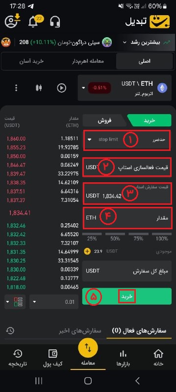 ۴. قیمت فعالسازی استاپ: قیمتی که میخواهید در آن محدوده، سفارش شما فعال شود.