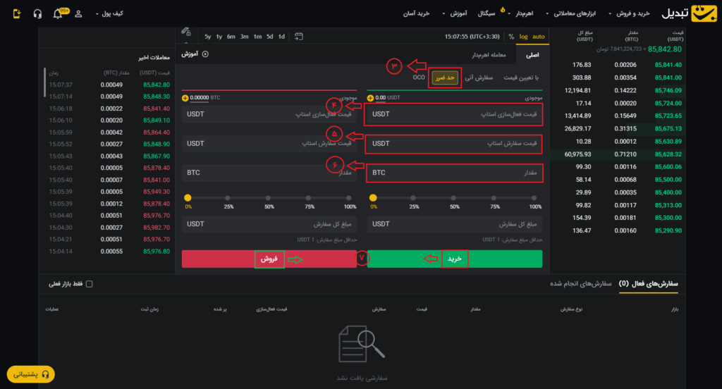 ۷. پس از واردکردن اطلاعات، گزینه فروش را انتخاب کنید تا سفارش شما با محدودیت حد ضرر نهایی شود.