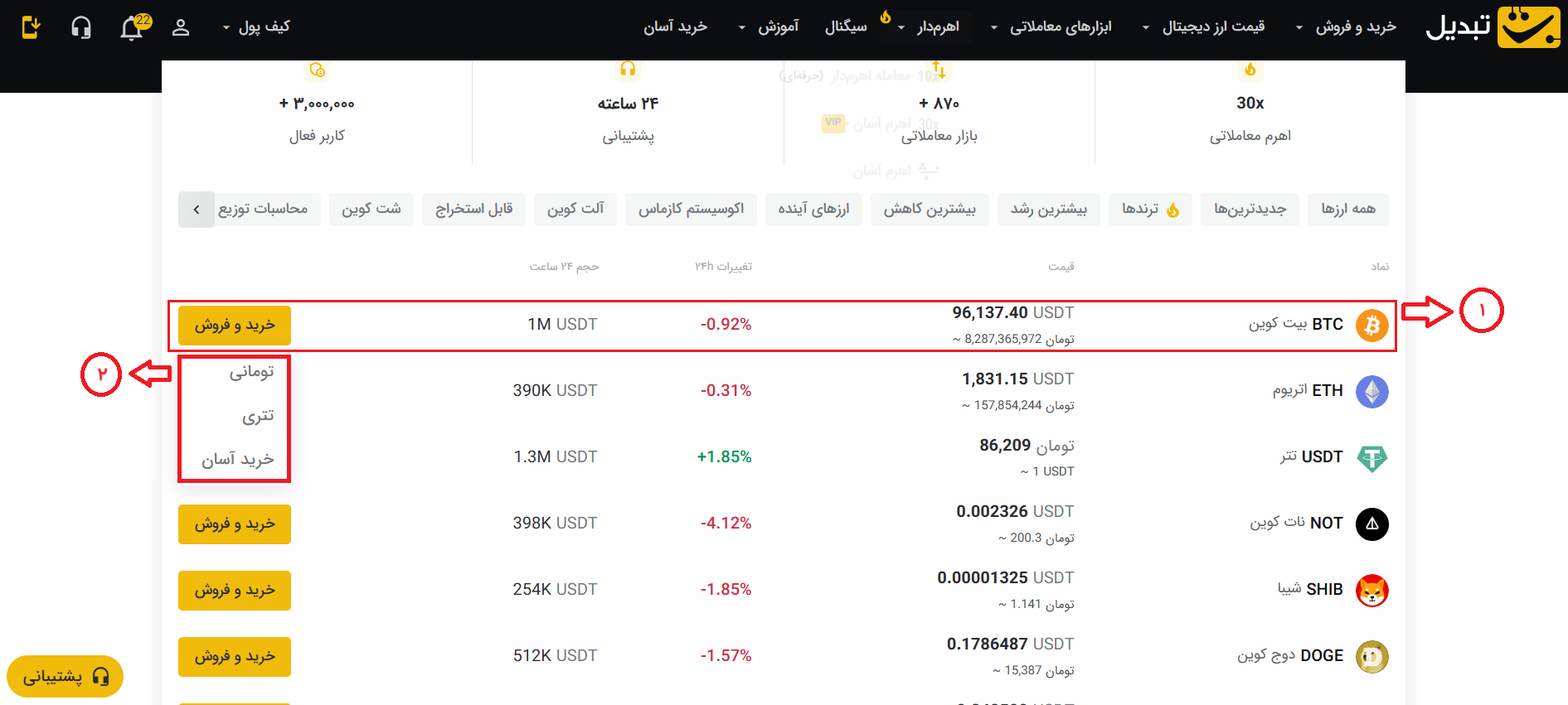 ۱. ارز دیجیتالی که میخواهید معامله کنید را انتخاب کنید.