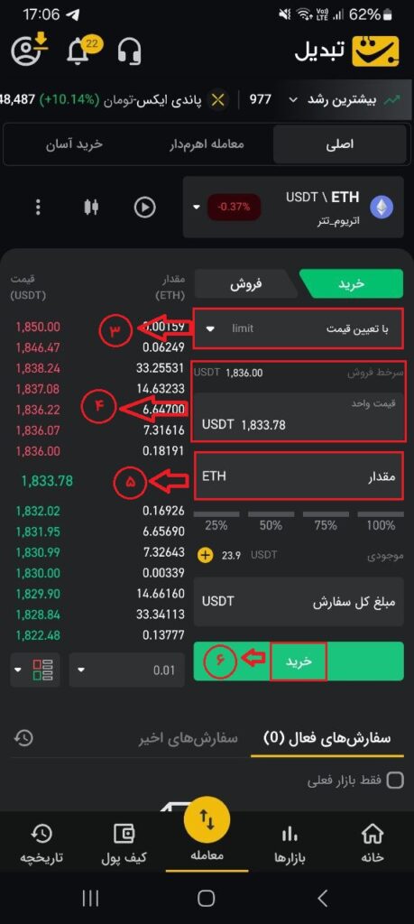 ۴. در کادر مربوطه، قیمت ارز دیجیتال موردنظر خود را بر اساس تتر یا تومان وارد کنید.