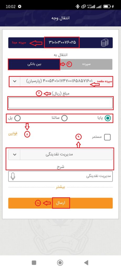 ۵. در قسمت سپرده مبدأ، شمارهحساب بانک سپه خود را انتخاب کنید.