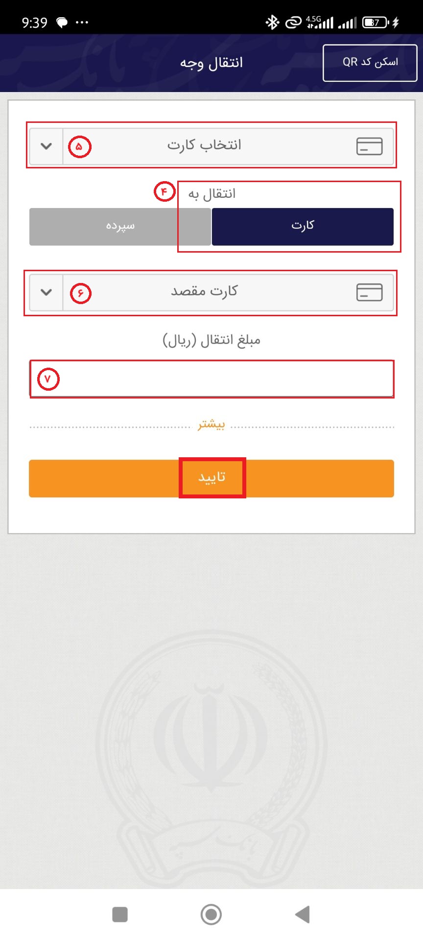 ۷. مبلغ انتقال را وارد کنید و گزینه تایید را بزنید.