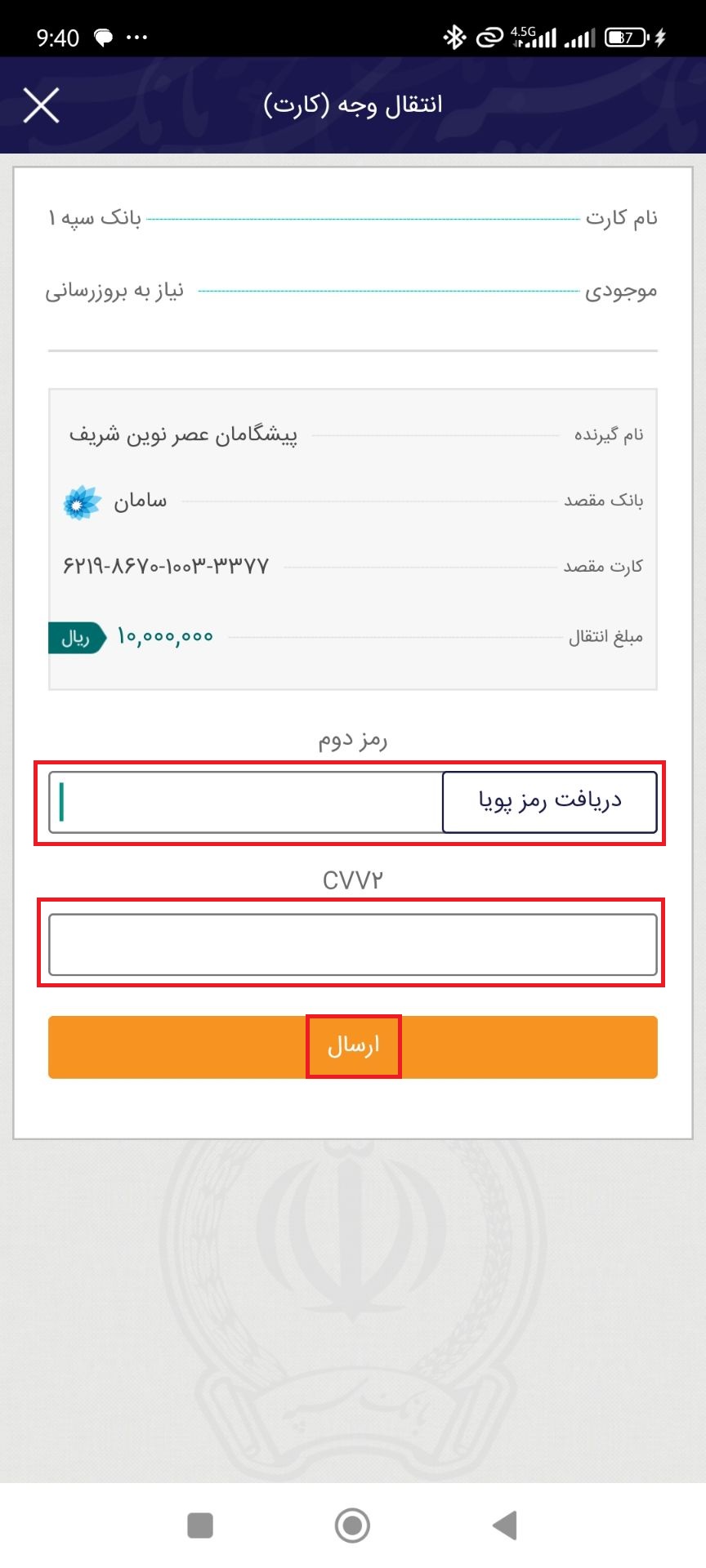 ۸. رمز پویا و CVV2 کارت سپه خود را وارد کنید و در نهایت گزینه «ارسال» را بزنید.