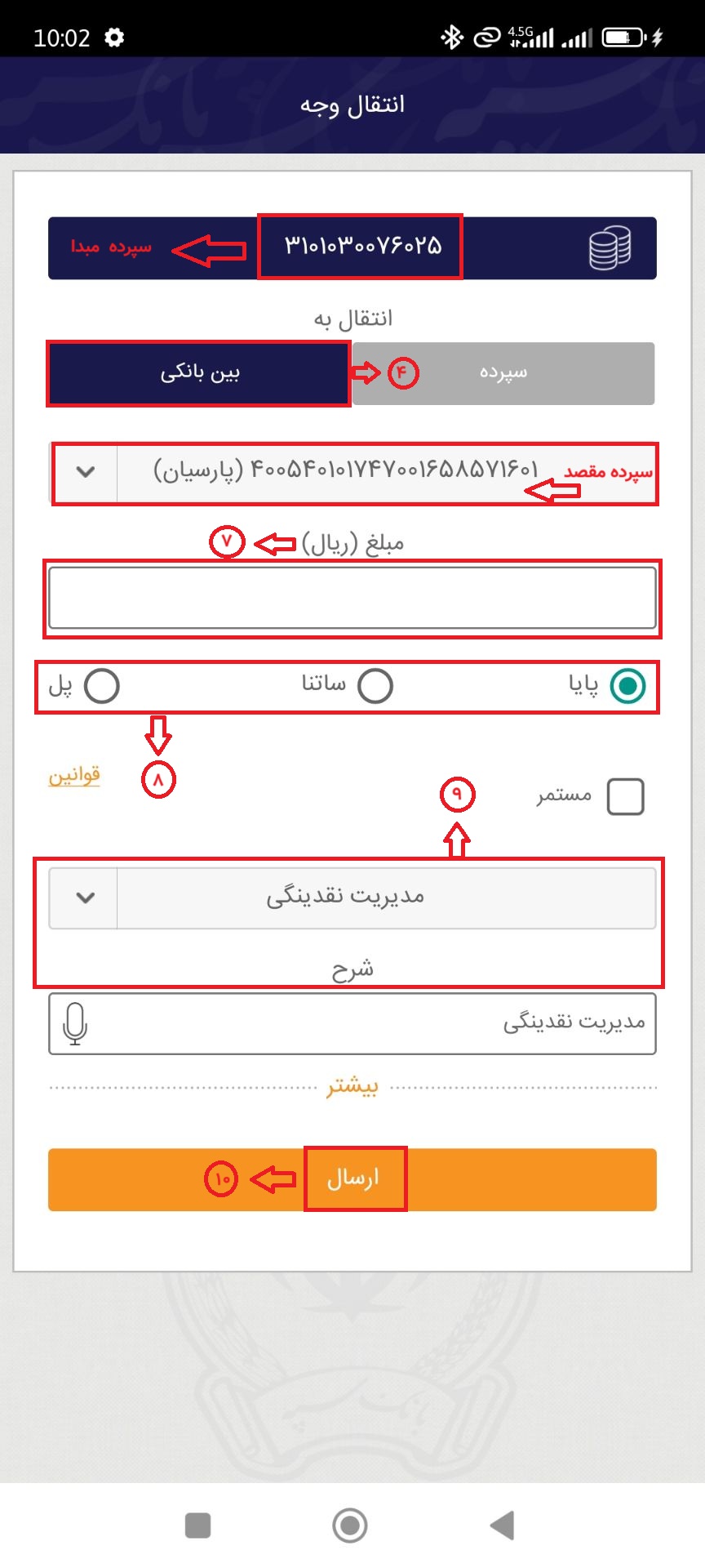 ۱۰. در نهایت گزینه «ارسال» را بزنید تا واریز شناسهدار شما نهایی شود.