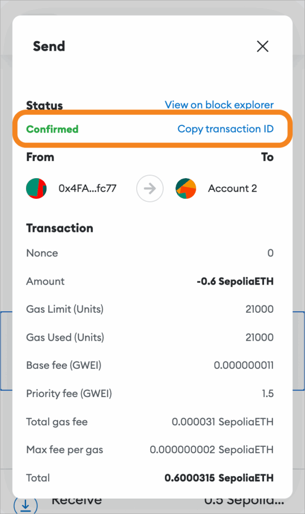 - اکنون صفحهای نمایش داده میشود که در آن گزینه Copy Transaction ID (کپی شناسه تراکنش) قابل مشاهده است. با کلیک روی این گزینه، شناسه تراکنش در کلیپبورد شما کپی میشود.